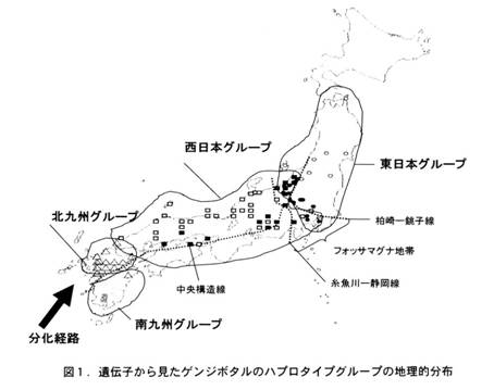 1−3 注意すべき遺伝子の問題 最近の研究によれば、同種のホタルであっても、地域ごとに発光パターンや生態が異なることがあり、遺伝子も固有であることが明らかになっています。 そのことから地域固有のホタルの遺伝子を保存することが、ホタルの種の保存を確保する上で欠かせない要件になっています。 そのため、やたら遠方からホタルの幼虫を、無配慮に持ってきて養殖放流することは厳に慎まねばならないと言われています。 これに関する研究「遺伝子から見たホタル個体群の地理的分布と遺伝的分化」(*1)によれば、ゲンジボタルは南方から九州に入ってきて分化し、現在の日本産ゲンジボタルには、東北、関東、中部、西日本(近畿、中国、四国)、九州北部、九州南部地方の6つのグループが存在すると報告されています。 この地理的分布を示したのが、下の(図1)です。 私達もこの地域固有のホタル遺伝子分布状態を攪乱しないように、今後とも十分注意して養殖や放流を進めて行かねばならないと考えています。